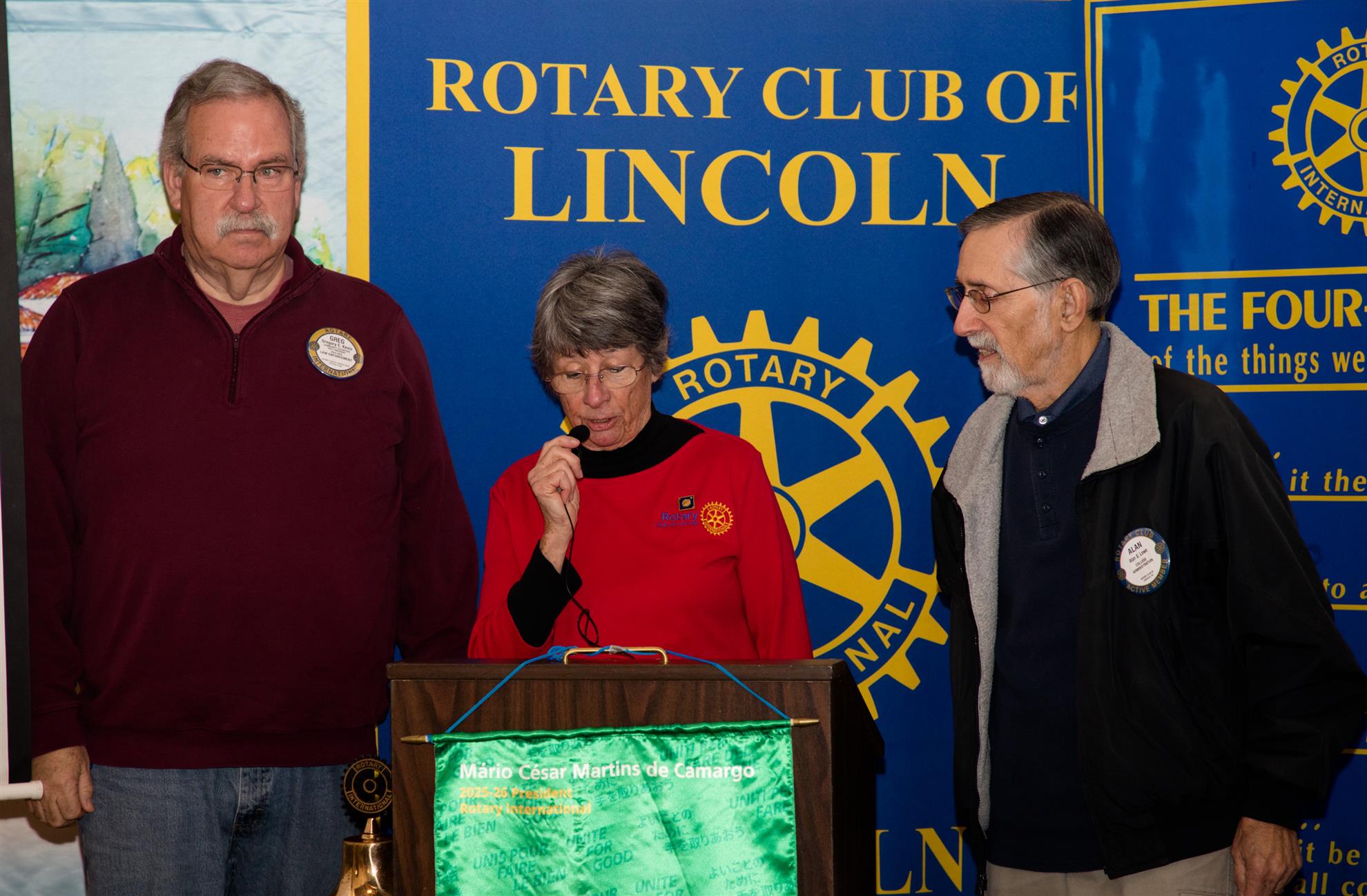 Rotarian Joann Hilton presented Greg Kevin (currently AG) with the pin representing PH + 6 , and Alan Lowe PH +7. Joann discussed the requirements of Paul Harris recognition and congratulated Greg and Alan for their generosity. The Rotary Foundation helps Rotary members to advance world understanding, goodwill, and peace by improving health, providing quality education, improving the environment, and alleviating poverty. Congratulations were expressed with a standing ovation.