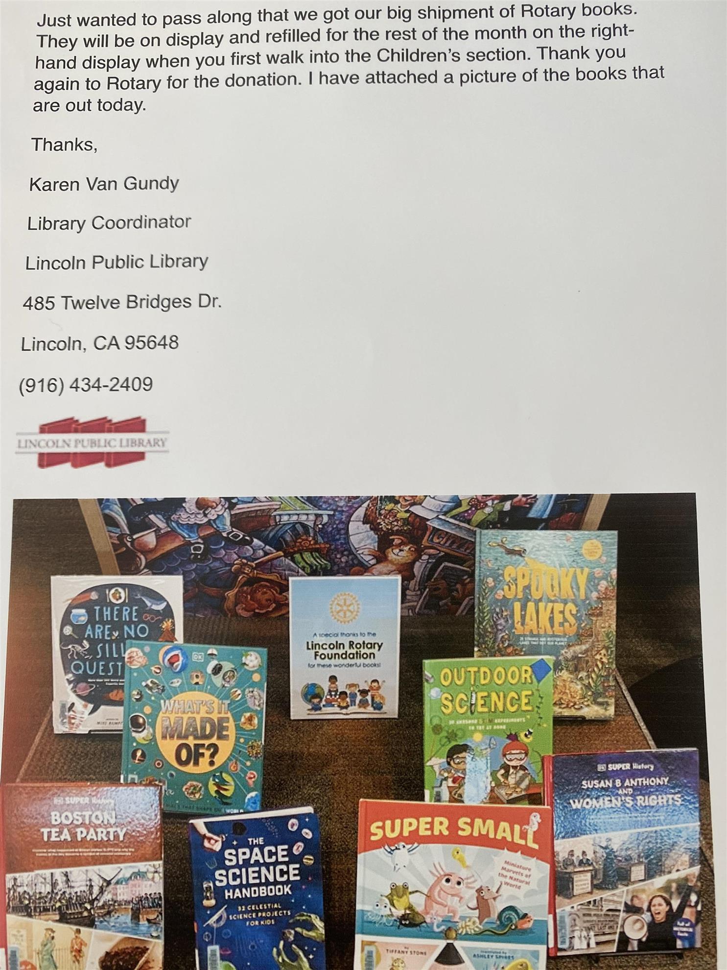 Paul, WSC member, provided this picture of the thank you note and books that were delivered to the Lincoln at 12 Bridges recently. Claire reported that many members attended the 5th week social at Legacy Sports Bar last week. Kris again asked for more judges and timers for the Speech Contests. W. Bill reminded members of the Feb. 13th Community Blood Drive and said that he needs to retire from leading this event. Hard shoes to fill, but someone is needed to take the position. Greg reported that Josh Graves has beennominated to be president elect-nominee for 2027-2028, by the committee of past -presidents. A vote of members was taken, and Josh was approved without dissent.