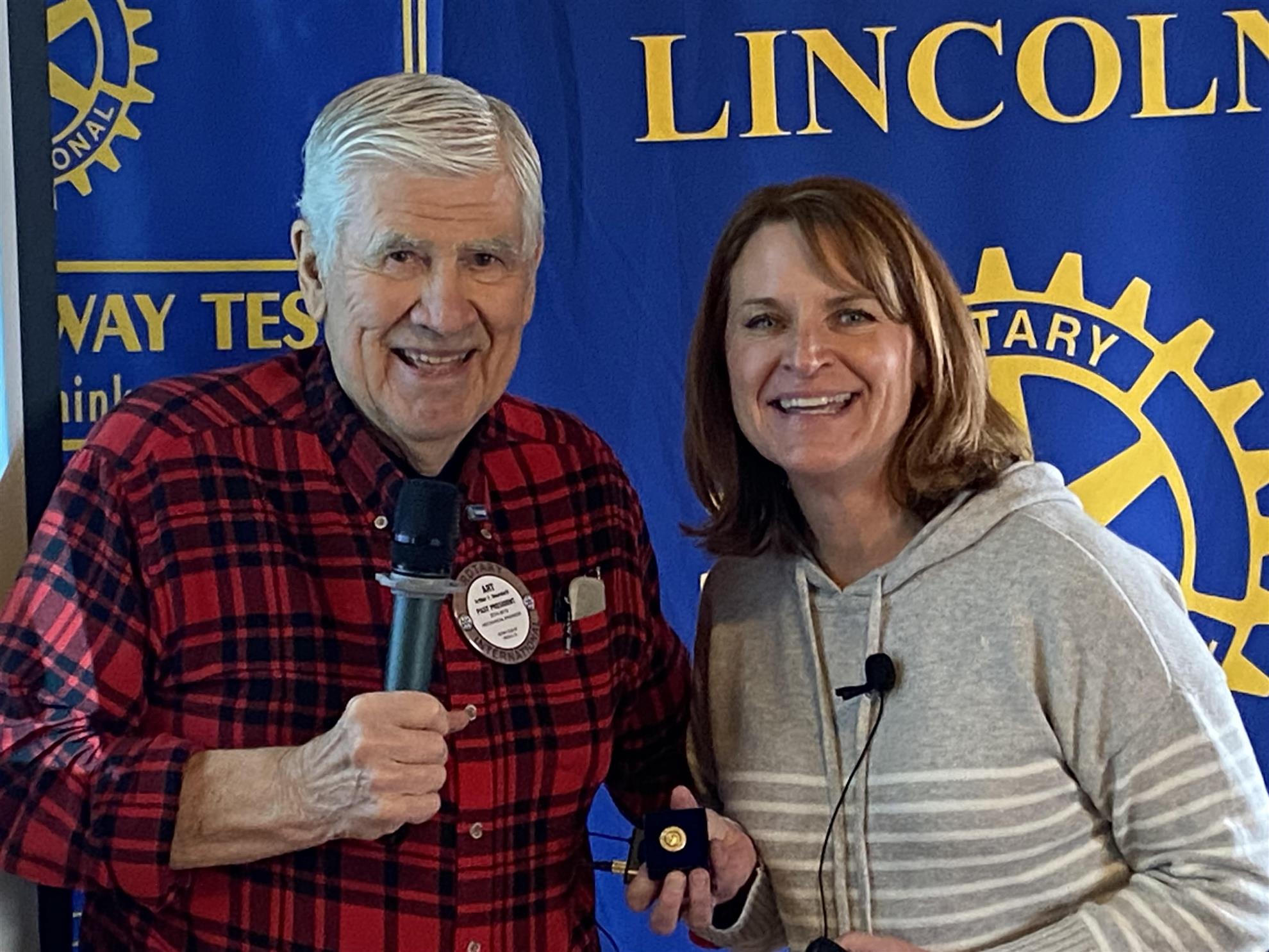 RI Foundation Chair Art, presented Kerry with her Paul Harris +2 Pin. The Rotary Foundation helps Rotary members to advance world understanding, goodwill, and peace by improving health, providing quality education, improving the environment, and alleviating poverty. Congratulations were expressed with a standing ovation.